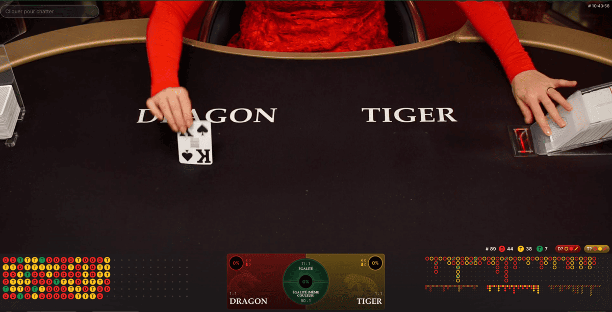 Pour en revenir au principe du jeu, il consiste, pour le joueur, à deviner l’issue de parties opposant, à chaque fois, la carte du Dragon et celle du Tigre.